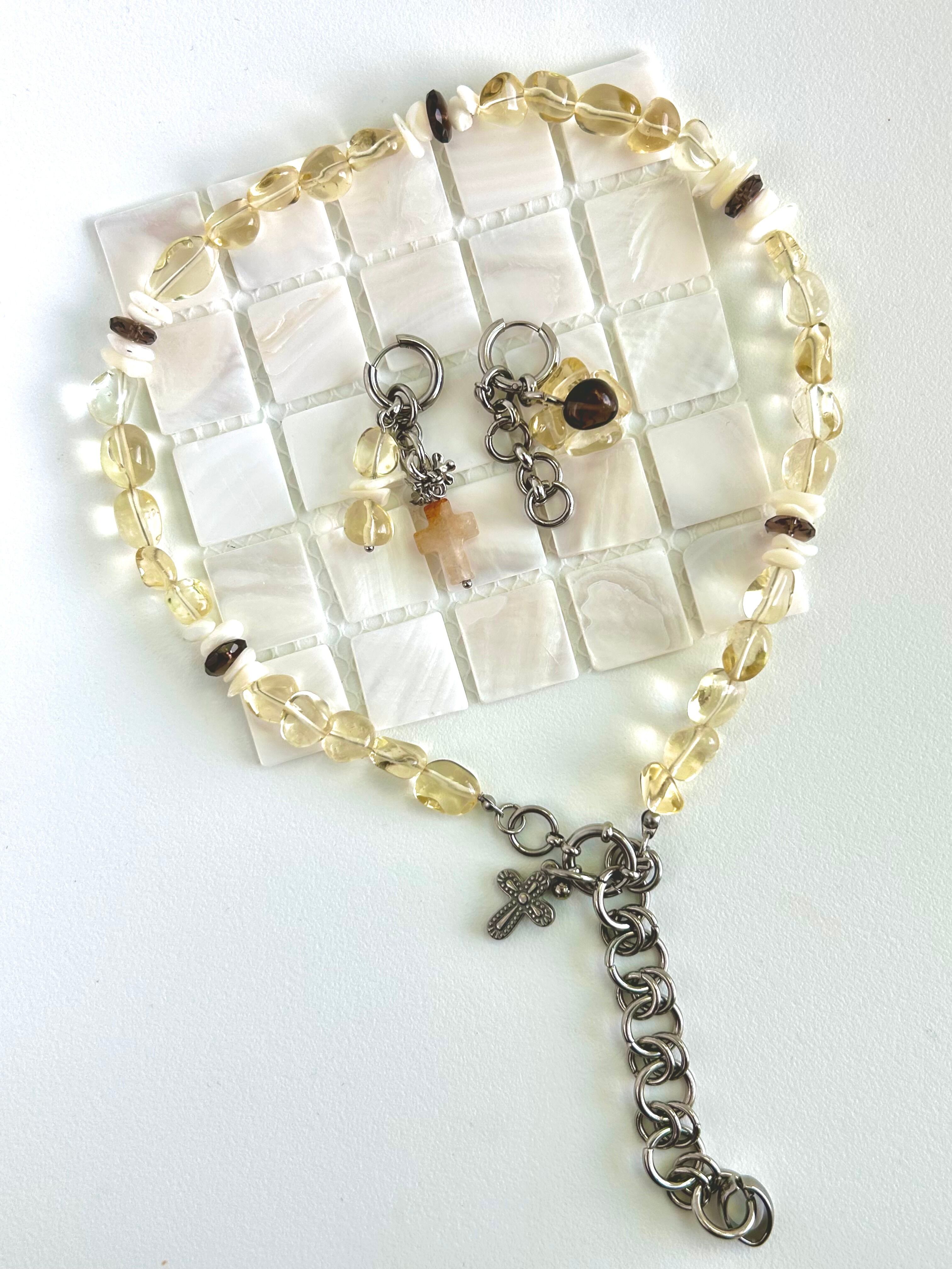 レモンクォーツの様なグラスビーズとスモーキークォーツでできたフラワーも
