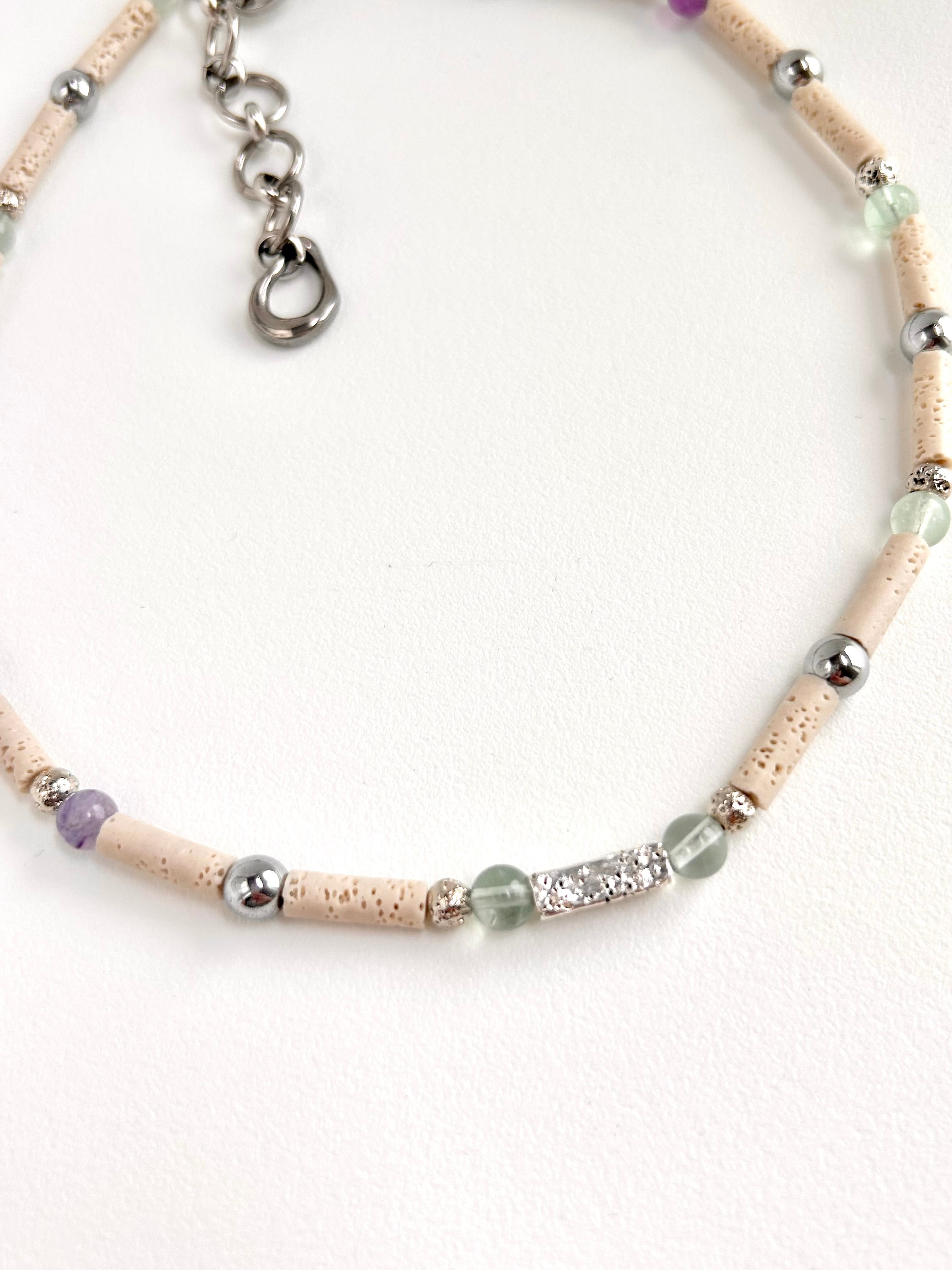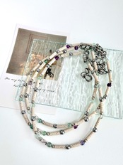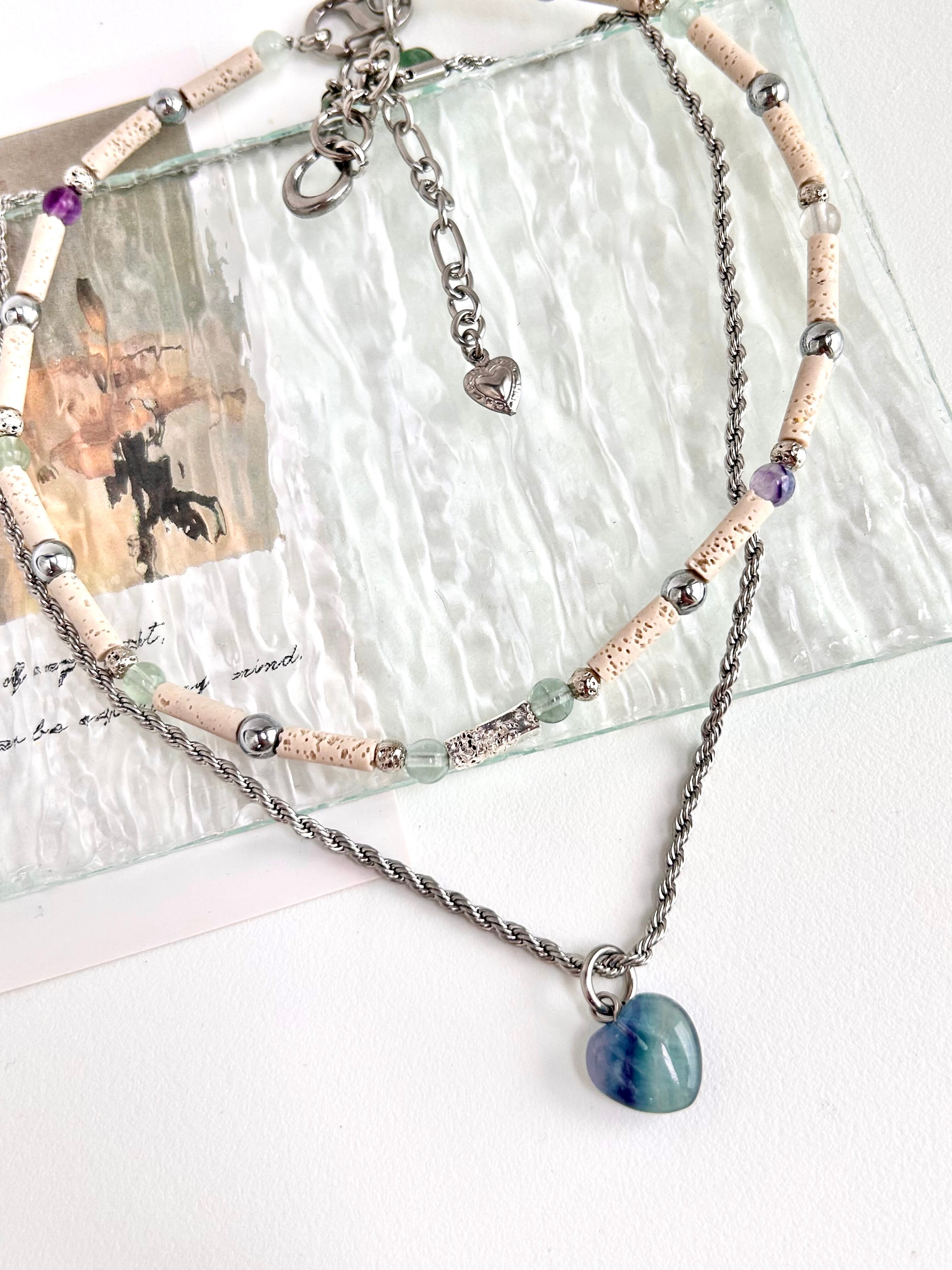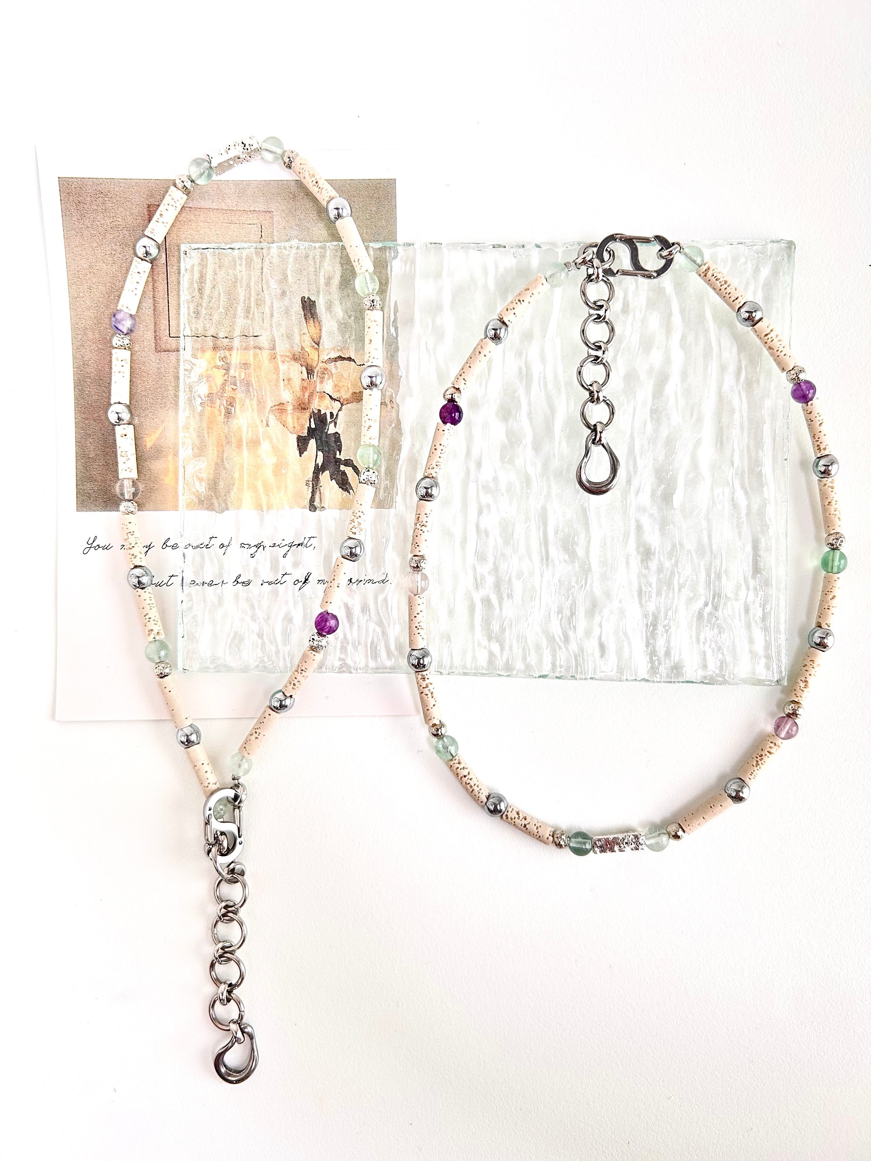 ヘマタイトと淡く透明なフローライトを規則的に並べたネックレス