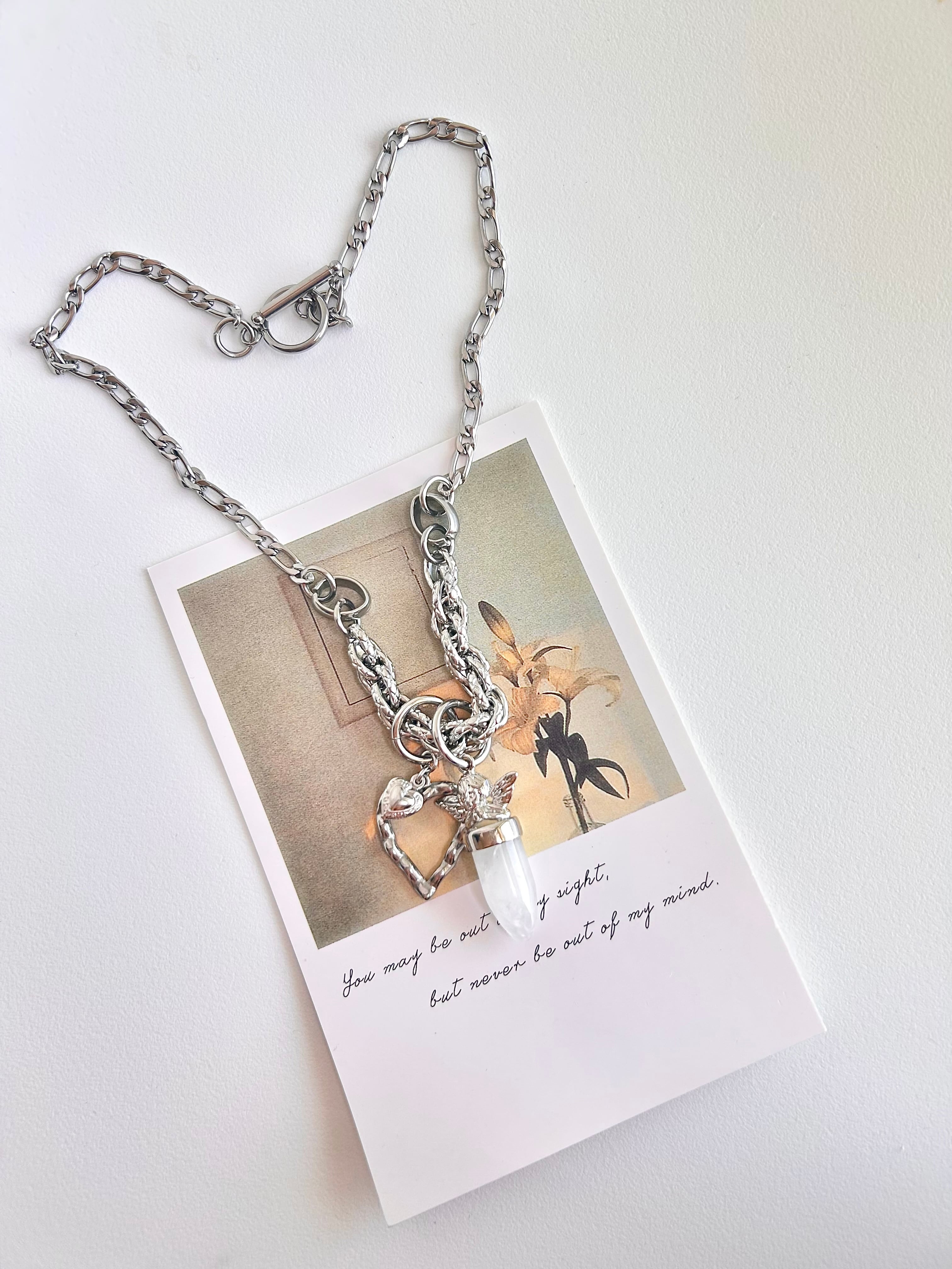 天使のロッククリスタルとハートモチーフのダブルチャームのネックレス