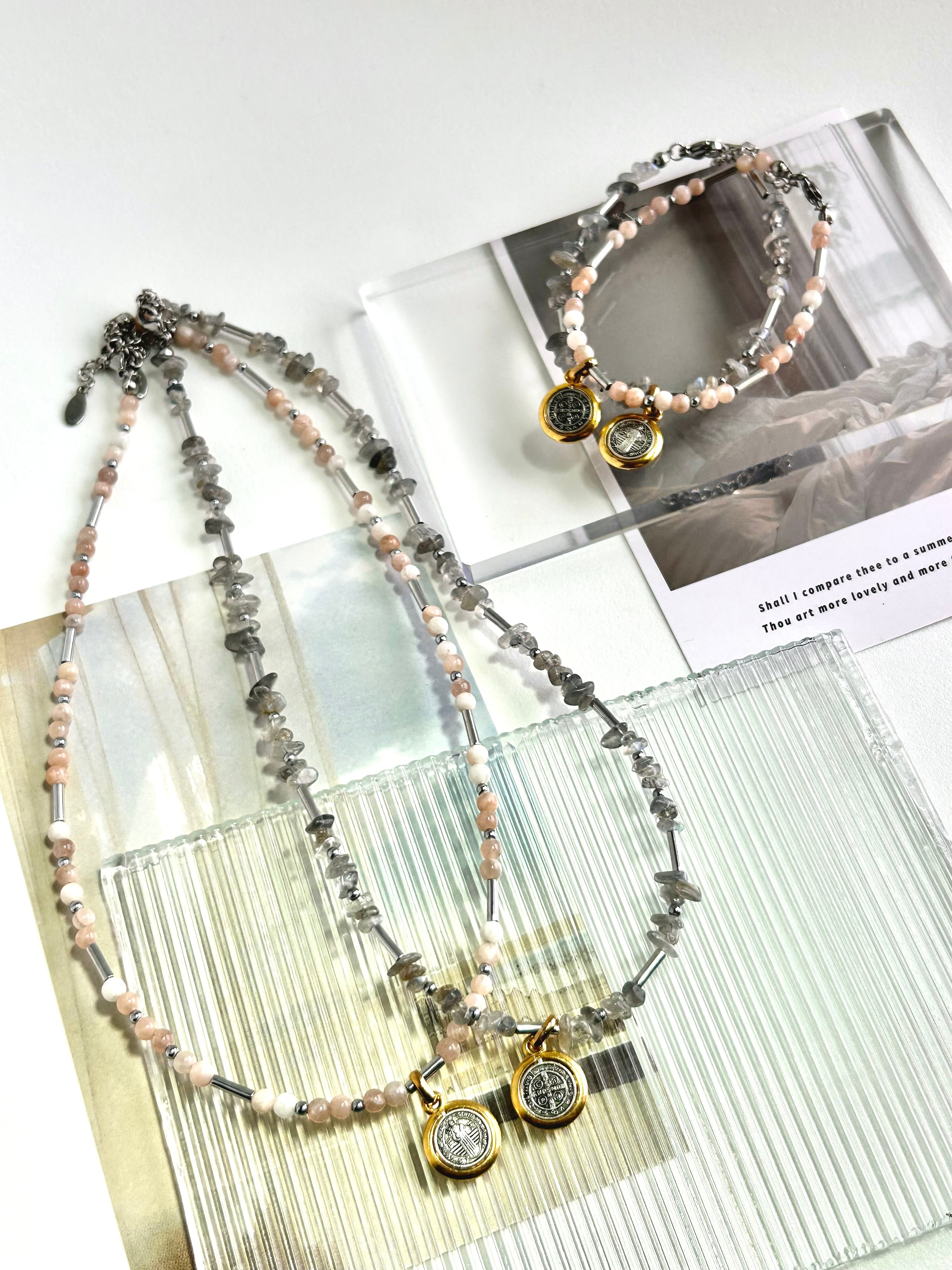 シルバーのビーズもガラスではなく天然石のヘマタイトを使用しました